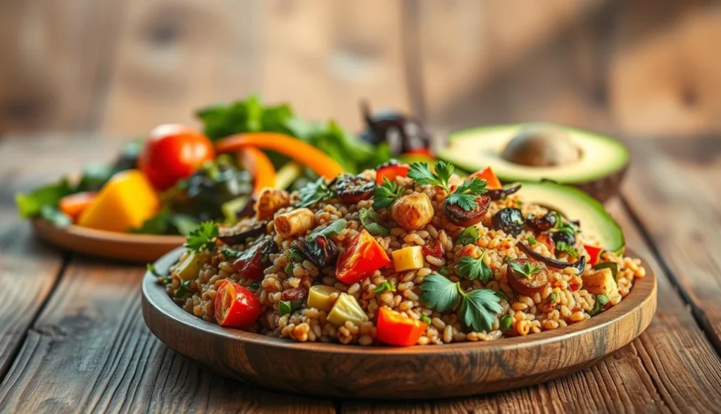 A base do seu prato pode ser arroz integral ou quinoa. Esses grãos são cheios de nutrientes e dão energia.